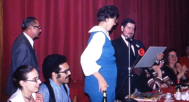 Sunday night was the Grand Finale: a party in the bar lounge which lasted through until breakfast when there were still some 23 of us (according to Norman Shorrock, the only person still able to count) in the bar. Ted Ball bought the last drink before breakfast, appearing with a pint of bitter at 8.00am. Other stalwarts included Brian Aldiss (happily singing), Jim Blish, and Samuel 'Chip' Delany - a mixed company of card-players, singers, and talkers making up the rest.