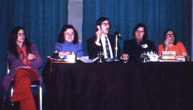 After the AGM I had to appear on Pete Weston's fan panel, along with Ian Williams, Peter Roberts, Jim Goddard, and of course the man himself. I forget what we were discussing, though I'm not sure we knew even then. "Be a bit extreme," Pete hissed to everyone before we began, no doubt realising that the five of us would probably be in substantial agreement on most things, despite his attempt to split us, both physically and philosophically, into two camps: the fannish fans (Ian and Peter Rabbit) and the gimlet-eyed sercon fans (Jim and me). To anyone who's listening I'd like to make another complaint about the set-up of panels at conventions (like the Philip Strick panel, this one I think had the virtue of being well-run and the defect of directionlessness): there are never enough microphones. Admittedly there ought to have been two between the five of us, but one was not working; nevertheless I think a convention ought to be able to get at least four together, so that people on these panels can speak when they have something to say rather than (as always happens at present) when the mike happens to perambulate in their direction. In thit particular instance, I found that whenever the microphone was with Peter Roberts at the far end of the table I had something almost relevant to say, but by the time it had made its way across to me, comments made by the three between us had moved the discussion to an area where I felt I had very little to contribute. Was the same thing happening to the other panellists? Is it general in this kind of situation? If so, is it any wonder that however interesting they look on paper, panel discussions rarely generate anything really worthwhile. I know that if there were more microphones there would be the danger of everybody talking at once, but this might be preferable to the state of affairs when you can't talk when you want to.