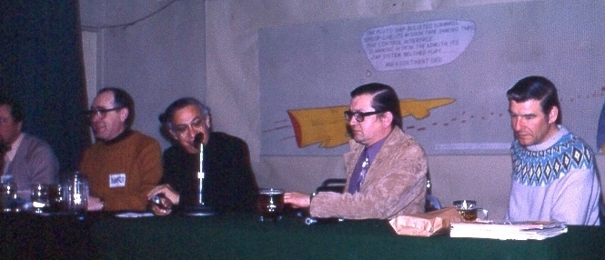 Presently we adjourned to a room party in the Burns's room. It was a small party, so I should remember most of the names. Bill and Mary Burns, of course... the Joneses... the Shorrocks... including son Roy (whom I now recognized as one of the folk singers in the bar on that famous night), Keith Freeman, Banks Mebane, Danny Plachta, Dave Kyle, Jenny Campbell, a girl named Wendy, and probably others. Our bedtime was approximately 4 a.m. (Yup, me too. I'd finally gotten my second wind - June.) PETER ROBERTS: I went to a Gannet party on Sunday evening but decided that more interesting things were happening elsewhere - as, indeed, most of the Gannets themselves did.