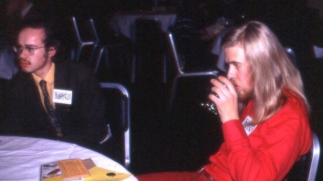 I referred to the Moffatts as 'unofficial FGoHs' earlier because of things such as sitting on the top table at the banquet, giving speeches there, etc. Had the committee known beforehand there would be enough money to cover their hotel bill I suspect this would have been official. JUNE MOFFATT: At some point we were sitting in the lobby, chatting with Dave Rowe and others. He had been telling a story about being overcharged at some restaurant, and started to say "bloody". Actually, he got about as far as "bl - er - excuse my French!" I laughed, and assured him that it was harmless as far as I was concerned. We know that it is a Naughty Word in England, but it has no emotional content for us. (Besides, anyone who's stayed with Ella Parker can't be shocked by it!) Dave seemed to accept my explanation. Later, when I told Marsha about it, she looked at me and said, "Well! Nobody ever excuses themselves when they say that to me!" I told her it was because I looked so Sweet and Innocent. It was later when she found out that I'm really just as vulgar as she is....