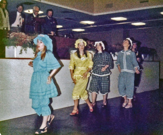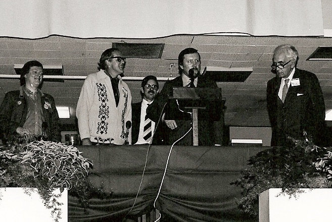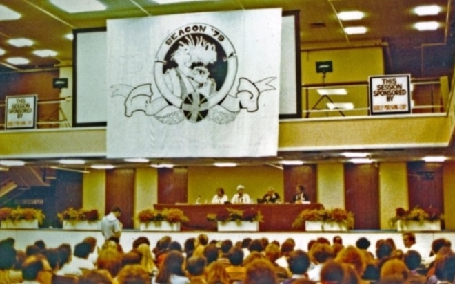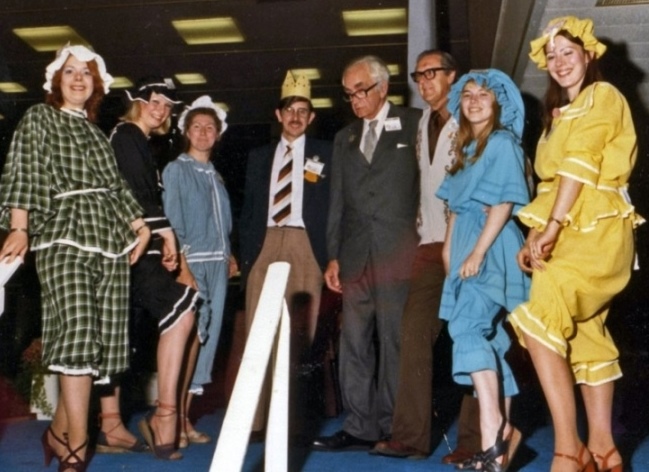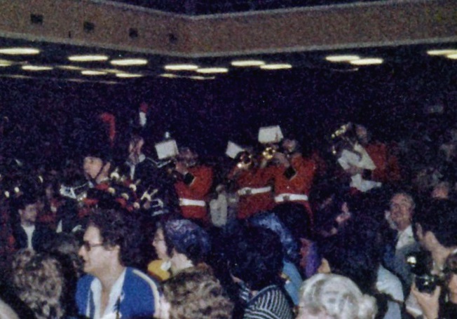 What about the band? Well, since we were in Brighton I thought it would be nice to have the Royal Marines. Of course, we couldn't afford the entire regiment... in fact, it turned, out that we couldn't afford any of them! Apparently this sort of thing is a nice little earner for these well-known regiments, so the best we could get were a half-dozen members of the Caledonian Pipe Band. Still, I thought the bagpipes and the uniforms would make a bit of a splash as they marched into the hall, and the Americans would like it, so we went ahead with the hire. KEV WILLIAMS: The ceremony was designed to wow these world-weary cynical Americans right from the start. To show that we Brits could really organise things efficiently. The second World War was not a flash in the pan you know! However, the best laid plans .... The ceremony was due to begin at 2:15. It was now 2:00. The pipe band (a Pete Weston inspiration - not too popular with others) was stuck in a traffic jam somewhere to the north of the city. "Stall 'til about 2:30, came the instructions from the chairman. Everybody stood by. The sound technician had all the music set up, the gophers stood at their posts, light switches, ropes to raise the Seacon banner at the prime moment. Sue was ready with the spots, Andy Firth had the bathing belles in the bar alongside the main con hall, buying them drinks and keeping them warm. I stood on the balcony ready to cue the slides and give all the signals for the sound, banner, spots, bathing belles and Scots Pipe band - although at that moment no Scots band. The tension on the balcony was palpable. 2:30 came and went. The slow hand clapping began. The music tape was on its third time through. I grabbed the walkie-talkie: