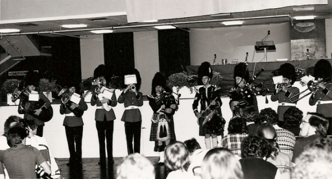 The only reply was a low moan. The lights came up, more jeers, and Pete walked onto the stage to be torn to pieces. He tried to explain the status-quo to an increasingly hostile audience. Such are the tribulations of leadership! The sound tech came back at a run. "S'okay now... let’s run!" I signalled frantically to Pete to get off the stage. The lights went out. Another jeer from the mob below. The anthem blared forth from the speakers! The slides worked, the banner worked, the spot light picked out the logo and as the anthem reached a crescendo, a huge cheer arose from the audience, who then frantically applauded. Congratulations at last. SUCCESS - so far! But what of the band, or piper and drummer?