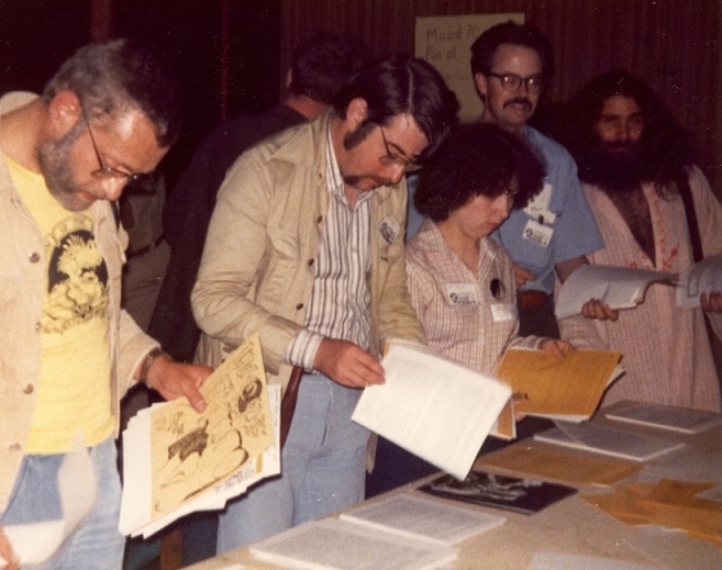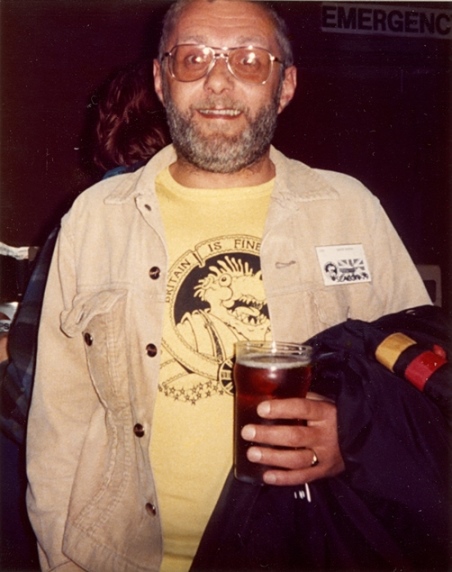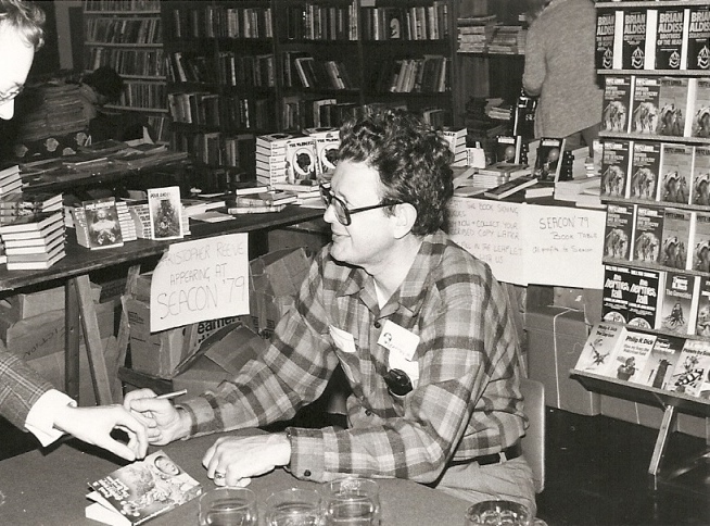 PHIL JAMES: I roamed the lobby looking for people I knew, collecting the autographs of famous authors as I went; Brian Aldiss (British Guest of Honour), Alexei Panshin (looking like Mike Moorcock, Economy Size), Bob Silverberg, Joe Nicholas. Joe Nicholas? Well, I mistook him for Chris Priest, shoulder bag and all. I said it was a strange transition! I eventually found some faces I knew in the Fanroom, which was huge, almost an aircraft hangar. Greg Pickersgill, Simone Walsh, Kev Smith and others were in charge of the Amazing Expanding Fanzine Stall and I met John and Eve with Alan Dorey at the BSFA desk.