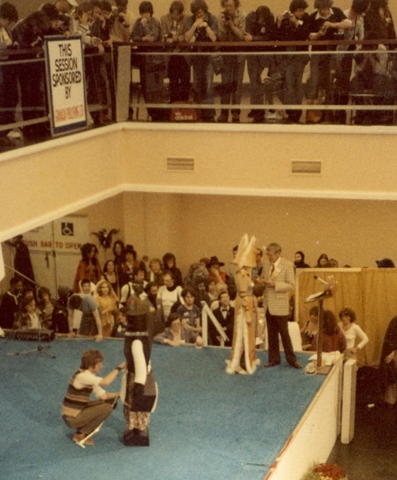 In addition there were representatives of various groups and con-bidding committees, including a Yugoslavian contingent present. There were exhibits of artwork and photographs of fans in compromising situations. There was even the unprecedented sight of thirsty fans forming an Orderly British Queue to get to the bar: And of course there were the usual games machines (on which a few famous fen met their dooms for want of the tactical skills that can be gleaned from any Perry Rhoden novel). For some obscure, patriotic reason, I attended. the opening ceremony with two American fans; Cathy and Mark Ball who were equally bemused by the proceedings. PETER WESTON: The Opening Ceremony [was] my baby, something I'd fought for at committee meetings, something I was determined to do properly. My belief was that so many conventions fail because they never get properly started. They just sort of creep into life when no-one is looking, never develop a head of steam, that sense of involvement which is so necessary if attendees are going to knit together to make the whole greater than the sum of its fans. The rest of the committee were unenthusiastic, they could see problems. And what exactly did I propose? Music, I suggested. At Discon I'd been very impressed by the colour and spectacle of the Alexandria Pipe Band, which Dick Eney had arranged to march through the convention one evening (though I never found out exactly why). And a bit of comedy would be good. What if I got hold of a fake machine-gun and pretended to mow down the rest of the committee? They looked unimpressed. All right, I said, so what if they were to mow me down? They brightened somewhat at this, but still said no. In the end Kev Williams came to the rescue. He and his wife Sue had already agreed to paint our backdrop for the main hall, a huge thing that would stretch across the width of the room and would necessarily drop through two floor levels, It must have measured something like 30 x 20 foot, in white, with Harry Bell's "fannish lion" symbol, and our slogan, "Britain's fine in '79". "So," said Kev, "what if we hang the backdrop against the wall, but for the opening we have it rolled up against the ceiling so we can project the symbols of previous worldcons onto the wall behind. While we're doing this we can play some music, gradually getting louder, until at the right moment we give 'cm a full blast as our backdrop comes down. A sort of audio-visual build-up, and then Peter can come on and say his bit, and he can have his marching band, too, if he wants it." Well, he sold me, and the rest of the committee too, although Kevin's proposals caused considerable technical difficulties and I never did find out how he managed to transport something so big and heavy, and get it rigged up in the way he wanted. His choice of music was superb, and during rehearsals his slide-show worked wonderfully, as the conventions marched through the years to a stentorian voice-over "1975 - Melbourne; 1976 - Kansas City;" and so on, culminating in the awe-inspiring moment when the voice said "1979 - Brighton" and our backdrop slowly rolled down to the dramatic theme from `Rocky'. It brought tears to my eyes, it really did!