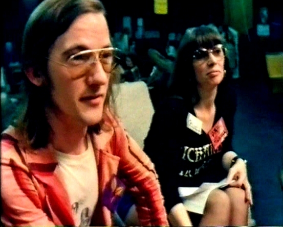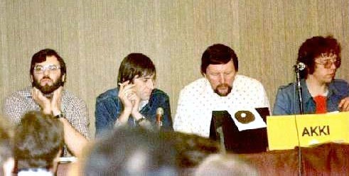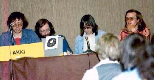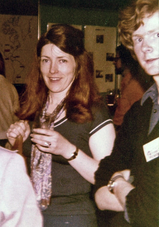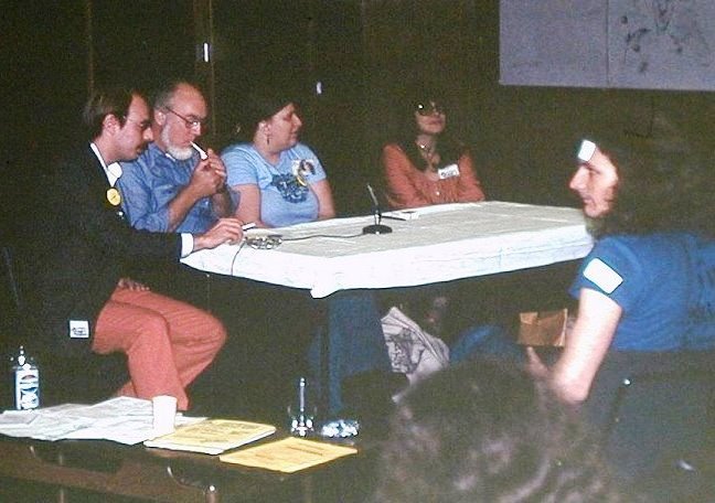 PETER ROBERTS: Fan programme began Friday. Sound system had blown and I'd completely underestimated the number of people casually using the room whilst the main programme was in full swing. So it goes. The American Fandom panel (Frank Denton, Suzle Tompkins, Rich Coad, and Joyce Scrivner) started amidst surrounding hubbub – things looked grim when well-meaning but long-winded Aubrey MacDermott seized the mike for a detailed history of US fandom in 1929. Panel survived, however. I chaired an interview with TAFF & GUFF winners, Terry Hughes & John Foyster, and then moved on to the first of the British Fandom chat shows (with Ken Bulmer, Bob Tucker, and Ken Slater), retaining the chair myself since I'm useless at delegating things,