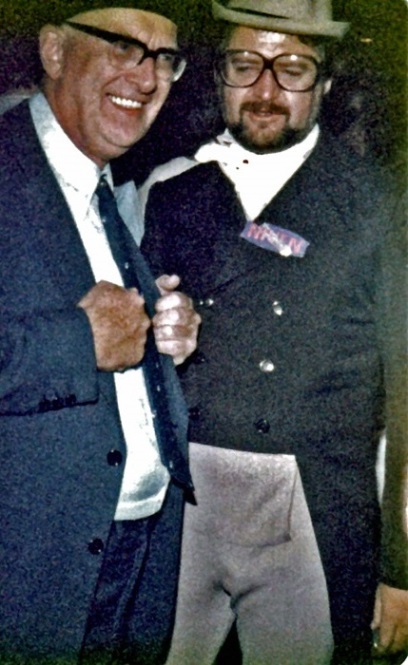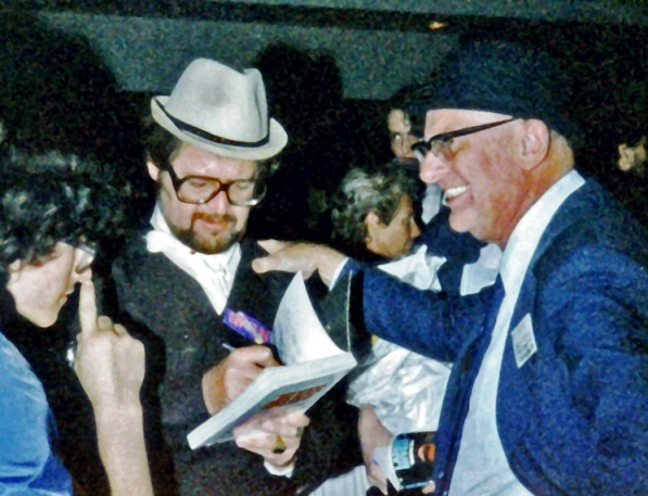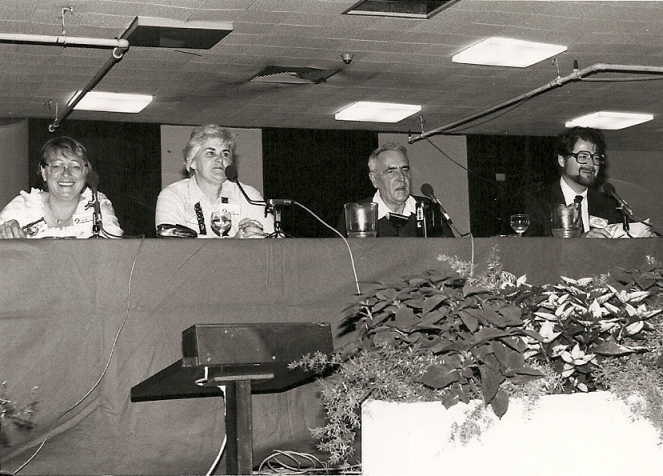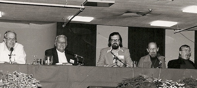 I was scheduled to moderate a panel at 1:00, so after the tour I left the group and went back to the convention hotel. The panellists were Jack Williamson, Manly Wade Wellman, Ted Sturgeon and Alfred Bester, and in my introduction to the audience I said I'd been chosen as moderator because I was the oldest. (Har har.) Our topic was "Fifty Years of Science Fiction," because the term had first appeared in print in 1929, having been coined by Hugo Gernsback - "the man after whom the Nebula Awards were named," I said brightly, chuckle groan. Actually, the panel went very well, largely because I realized early that if we talked about nothing but how science fiction got named we'd run out of things to say within fifteen minutes; so instead I steered the discussion to additional anniversaries, like the fortieth anniversary of the first world convention, which Williamson and Wellman had attended, and the fortieth anniversary of the first sf sales of Bester and Sturgeon. It all came out rather neat and jolly, despite the fact that (as I later learned, and thank God I didn't know it at the time) two of the panellists weren't overly fond of one another.