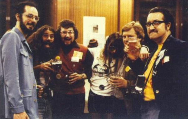 PETER NICHOLLS: I was not alone hoping to meet the rich and famous. Every time I went off in search of them, usually finding them in large clusters in close proximity to their natural nutrient, free booze offered by publishers in extravagant suites, I found that little Mal had got there first, calling Frederik Pohl Fred, Laurence van Cott Niven Larry, but not making my mistake of calling Chelsea Quinn Yarbro Chelsea (she's called Quinn). (Incidentally, my only contact with Alfred Bester was quite enigmatic... I was crossing the bar trying to hold five drinks, and Bester came up and took them from me. "Here," he said soothingly, "let me carry those for you. You look very tired." This from my long-time hero, a man 26 years older than me, was bad for morale.)
