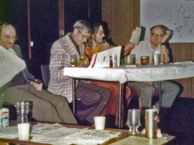 Fan team (Roy Kettle, Malcolm Edwards, and myself) beat off the pros (Bob Shaw, Chris Priest, and Rob Holdstock). Having been on the programme for three straight hours, I left Eve Harvey and Mike Glicksohn to interview Harry Bell, Fan GoH, and collapsed into a nearby bar.