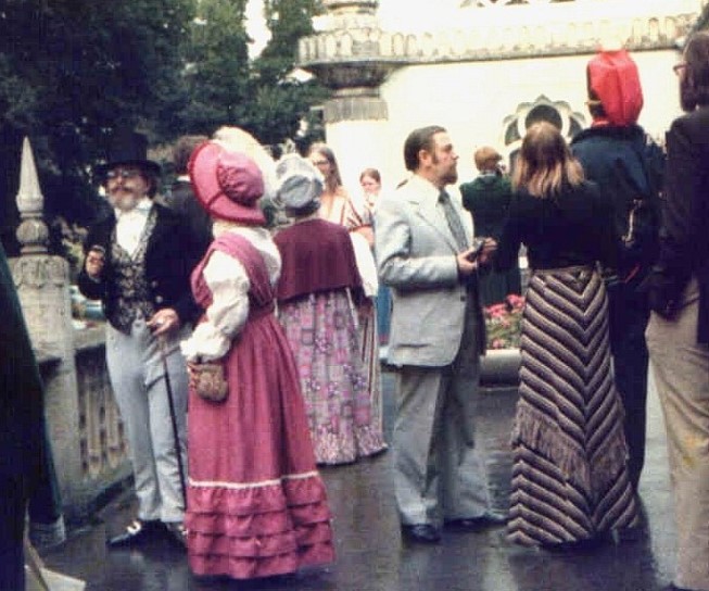 TERRY CARR: Friday morning came up sunny and warm, so a bunch of people decided to walk to the Royal Pavilion for a tour of that fabled pleasure palace. Let's see: there were me and William Rotsler, Boyd Raeburn, Susan Wood, Len Wein, Joe Staton and a few more. When we came to the edge of the Pavilion's grounds, half a dozen of our group unholstered their cameras and began shooting film of the Indian-style architecture (which looks a bit better from a distance, by the way). Then we went inside for the tour, which took us through room after room exquisitely decorated and appointed in Oriental style: chandeliers with goldsculpted dragons curling over them, teak cabinets in the form of pagodas. Continental styles were in evidence too, like the domed ceilings painted with sunlit clouds. Not everything was superb art, of course, since a great amount of wealth doesn't automatically confer a great amount of taste, but the total effect overwhelmed nitpicking. The Royal Pavilion struck me as a combination of Versailles and Hearst Castle.