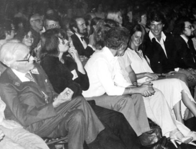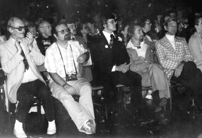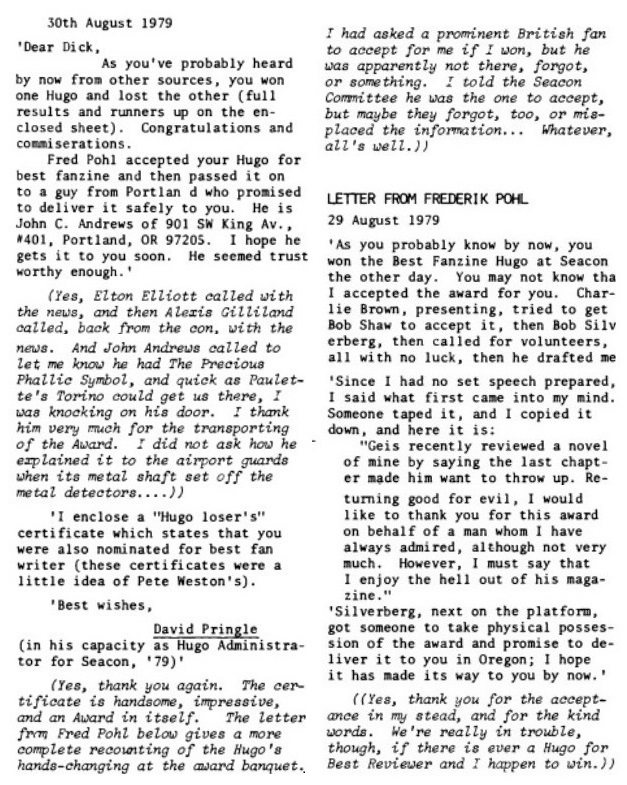 A description I'm sure Bob would've agreed with is that he was a fan whose day job was writing science fiction, so his delight was understandable. The award for Best Fanzine wasn't nearly as popular. Charlie Brown, who'd had the grace to withdraw from Best Fanzine contention the magazine from which he earns his living, announced the award, and his slightly disgusted tone of voice when he opened the envelope and said, "The winner is...SCIENCE FICTION REVIEW" was worthy of a Best Dramatic Presentation nomination itself. Few people applauded the award, and when Charlie asked who'd accept for Dick Geis, no one cane forth. Charlie began inviting people by name to come up and accept the award, but each shook his head. Finally, after three or four people had declined, Charlie called on Fred Pohl, and Fred, probably fearing that the program would never continue if someone didn't accept, came forth. He said, "I'm pleased to accept this award for Dick Geis, a man I've always respected...but not much." (Laughter; cheers.) "But by God I do enjoy reading his magazine," Fred added. The perfect touch of grace, I thought: Fred deserves a Best Dramatic Presentation nomination too.