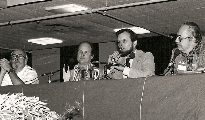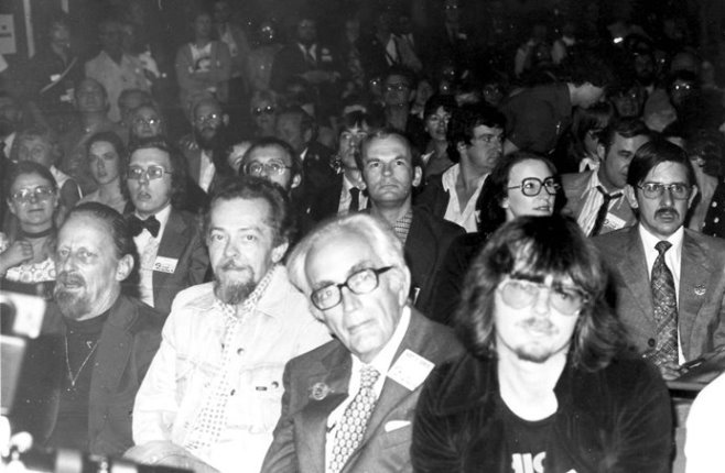 The Let's Trash Dick Geis Session didn't end there, though. Bob Silverberg was called to the podium to present one of the other Hugos; he mounted the dais carrying Geis's award and said, "Before I present this next award I want to take care of some unfinished business. Fred Pohl accepted the award for SCIENCE FICTION REVIEW and then dropped it into my lap to take back to Dick Geis. I live in California; Geis lives in Oregon, hundreds of miles away. I don't feel like carrying this thing back in my luggage - isn't there anyone here who's from Oregon who'll come up and take this?" Again there was a long wait, until someone did indeed come forth - I don't know who it was.