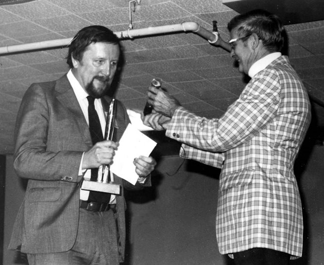 TERRY CARR: Bob Shaw was the toastmaster, and he was as usual delightful and witty. (He'd given a talk earlier that day that had kept about a thousand fans, all that could fit into the main hall, chuckling and chortling for an hour.) Bob is very popular in England and everywhere, so when Bob Tucker announced that he'd won the Hugo for Best Fan Writer he got a huge ovation. He jumped up and clicked his heels in delight.