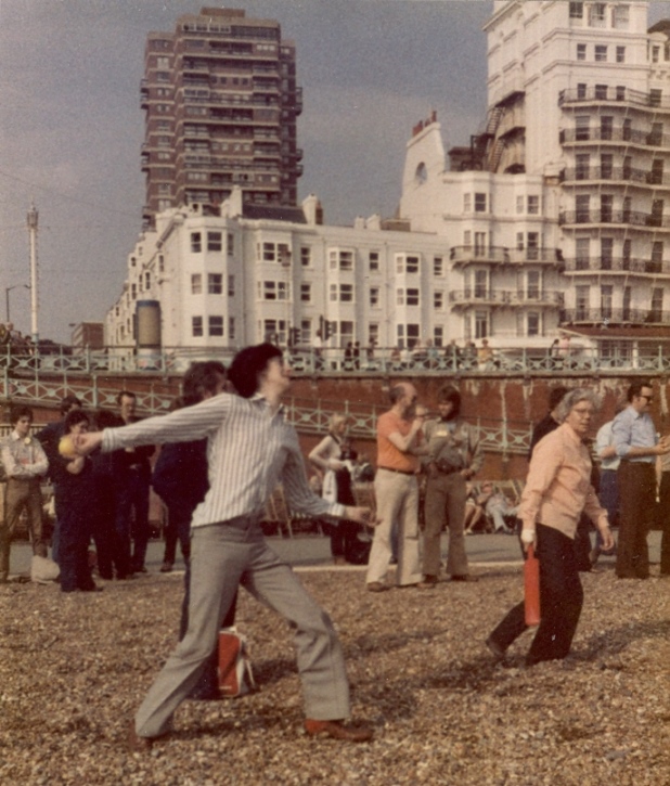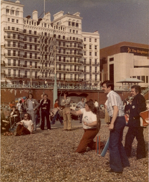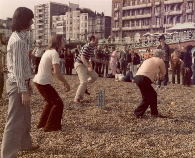 Immediately after the fiddling around in the gloom show I bounced out onto the beach for the England v. Australia Grand Seacon Cricket Match. Captains Pete Weston and John Foyster were already on the field (carefully constructed of pebbles), as were the teams – though separating the latter from the audience was none too easy. The opposition seemed to have a lot of South Africans, Americans, and Canadians for an Australian team, but no matter. I actually got a chance to bowl and get someone out – more than I ever did at school. We would've beaten the Australians, of course, had it not been for some unorthodox play (Joyce Scrivner thundering down the beach for a wild baseball pitch – the resulting six only stopped by Mike Glicksohn's rugby tackle of the batsman. Is this cricket?).