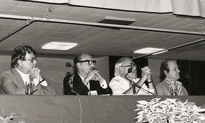Swedish fans at the convention were mostly wealthier than other fans and hit the booze harder. This last was because at that time alcohol sales in Sweden were restricted and it could only be purchased at government stores. So at Seacon they really let their hair down. After that there was supposed to be a 1965 Loncon slideshow, but despite the aid of over half a dozen willing investigators the damn projector wouldn't work. This failure of equipment had been bedevilling the main programme, but I thought we might escape. I tried to postpone the slides till the Monday, but the projector remained broken (that's why, incidentally, the closing ceremony didn't repeat the slides of past worldcon logos). I think there's an equipment hire firm that may be hearing from the convention – after all, we didn't do things on the cheap and we certainly deserved better.
