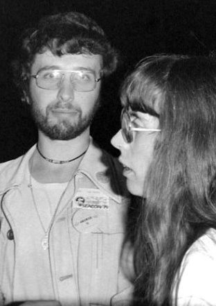The other awards? I applauded some, was chagrined by others; that's the usual state of affairs for all of us, isn't it? I did at least feel vindicated when Stephen R. Donaldson won the Campbell Award for Best New Writer, even if he did beat Lizzy Lynn: after all, I'd predicted it more than a year before. TERRY CARR: Dave Hartwell was holding the Hugo Losers' Party, so after a quick trip to my hotel to pick up a fresh name-tag I went to the Pocket Books Suite. Rotsler had given me two new name-tags the first day of the convention; one said CURRENTLY SPEAKING TO: followed by ten lines to be filled in, and the other was similar except that it said NOT SPEAKING TO:. I chose the latter as more in keeping with a Hugo Losers' Party. When I entered I ran into a bunch of women animatedly talking about Christopher Reeve. "When I saw him, I just broke up laughing - all I could think of was *Superman* has come to the convention'!" said Ginjer Buchanan.