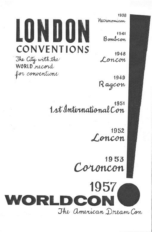 The first use of the name 'BOMBCON' to describe the September 1941 gathering I'm aware of occurred fifteen years after the event when it gets elevated to a convention in the pages of the programme book for NyCon II (aka NEWYORCON), the 1956 Worldcon, in an ad for the 1957 London Worldcon. The ad would have been the work of Ken Bulmer, who was in charge of 'Overseas Publicity' for the 1957 convention, and is an altogether peculiar piece of work. It calls our second convention NECRONOMICON (a name it had never had either before or since), 1948's WHITCON is listed as LONCON, and the 1949 convention is suddenly RAGCON. The 1953 one is listed as 1st INTERNATIONAL CON - which at least bears some resemblance to the name it appears under on the day membership tickets - but it had almost immediately been dubbed FESTIVENTION and has been known by that name ever since. Then there's BOMBCON. As seen in the reports on the previous page, at no point did anyone involved name the event a convention. So either Ken was misremembering, or he decided to consider it one to support his claim for London as "The City with the WORLD record for conventions". That such a list was able to be presented as an accurate one also highlights a problem that existed at the time and for many years afterwards: namely that there was *no* official list of British conventions. This state of affairs would not be rectified until 1971 when Peter Weston, wanting to print such a list in the programme book for that year's Eastercon, got together with Ken and compiled one. Unfortunately they made a mess of the pre-war cons, omitting the 1939 convention, including BOMBCON, and attributing the 1944 national convention in London to Manchester. They also reduced FESTIVENTION to just another national convention and omitted the 1957 Eastercon entirely. This was the list that would appear Eastercon programme books for the next two decades. As a result of the research I did in the late 1980s for for my history of UK fandom, I came up with a corrected listing that included the cons Ken and Peter had omitted, restored FESTIVENTION to its rightful place as an international convention, and dropped BOMBCON. This list was subsequently accepted as being more accurate and is essentially the one that has been used ever since. As for why I dropped BOMBCON.... It became obvious to me very early on in the writing of THEN that I needed to be clear on what is and is not a convention or conference. In the spring of 1978 I attended a weekend party at the London home of Greg Pickersgill and Simone Walsh (report by Dave Langford in TWLL DDU #12). Many of the most active fans in the UK travelled from different parts of the country to get there (I myself came up from Wales) and, because they were active fans a fair bit of fannish business got discussed and sorted out over the course of that weekend. At one point I remember saying: "Y'know, this is virtually a convention. We should declare it one." Someone, possibly Greg, replied: "Don't be daft!" And they were right. At the absolute least, a convention should have been announced and planned as such beforehand. It's not a status you confer in the middle of an event or retroactively declare afterwards. So that was my bare minimum for inclusion. Inevitably, there were things that met this minimum requirement yet still missed the mark in other ways, and those outliers I decided on an individual basis. In the case of BOMBCON the decision was an easy one. It didn't meet the minimum requirement, so it was out.