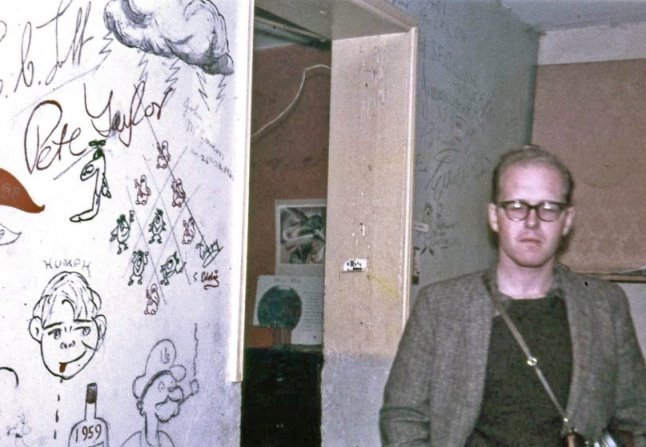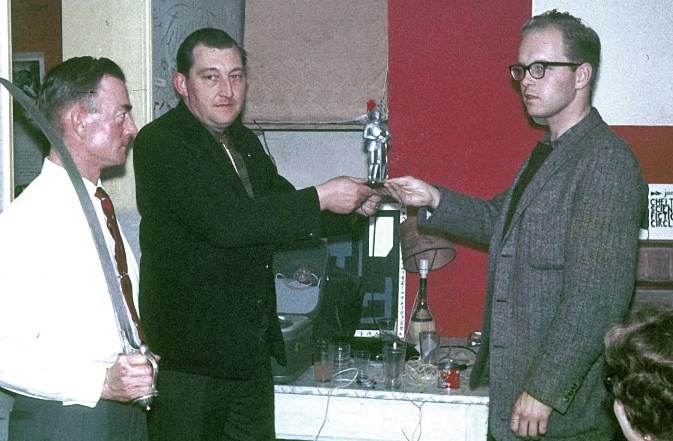 It was that evening and only then that I met Bob Richardson, the Knight Armourer. I'd intended to meet him again in London in '65 -- his collapse and death were bad news indeed. Next day a friend of Eric's from the Cheltenham tape-recording club came by about nine and interviewed the two of us for the B.B.C. Eric hoped that the uniqueness of science-fiction combined with my fan-sponsored visit would be sufficient to rouse local interest in the club and bring in new members; it's sadly that I here note the loss of their clubrooms less than a year later due to continued inattendance and flagging funds; the CSFC became too small to maintain their basement quarters with the wall full of signatures (which I signed directly beneath have & Ruth Kyle), and to worsen the situation Peter Mabey it necessary to go to London, and Audrey Eversfield to Paris. Early that afternoon - Thursday, that was - I boarded the train to return to London. (...extracted from A SQUIRREL'S TALE, link below) Links: