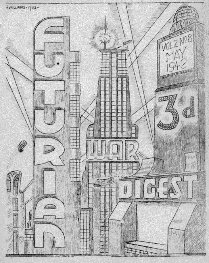 "FUTURIAN WAR DIGEST""""""""""""""""""""""""""""""""""""""""""""""""""""""""""""""""""""""""""""""""""""""""""""""""""""""""" Being an Amateur Magazine dealing with and devoted to British Fantasy "Fandom". Published twice a quarter from 4 Grange Terrace, Chapeltown, Leeds 7, England by J. Michael Rosenblum. Price 3d per copy. US. 75 cents for 12 issues. Reciprocal exchange welcome. Vol II. No.8: nicknamed FIDO and including sundry bric-a-brac perpetrated by fellow-spirits under the generic title of "the litter.. """""""""""""""""""""""""""""""""""""""""""""""""""""""""""""""""""""""""""""""""""""""""""""""""""""""" FIDO REGRETS --- to announce that forthcoming publication, at least in the immediate future, will be at six-weekly intervals approximately; in lieu of our previous monthly appearance. We have felt this coming for quite a while but were extremely reluctant to cross the Rubicon.. However we offer the following couple of facts; paper went up another 10% to 20% in cost at the beginning of May and (quote from Tucker s Le Zombie) of the 80 odd titles listed in the 1941 Fanzine Yearbook only ten U.S. publications claimed to be "monthlies". And of those ten not one managed to appear 12 times during the year. LeZ and Voice of the Imagi-Nation led the parade with nine issues each. Excepting the news-weeklies then, there two led the field. (Quote ends) Why should we continue to show up the Americans? Incidentally, Tucker listed FIDO with 10 appearances in 1941 but adds - "others perhaps lost at sea". We came out the full 12 times, Bob, and if you (and other Yanks) will notify us of the missing leaks, we'll have another try at getting them across the pond till our supply of back numbers is exhausted. Coming back to the point, proposed publication schedule is to appear twice each quarter, i.e. eight times a year, in the well-known Spaceways manner. Expect FIDO then on the 1st of July, 15th of August, 1st of October and thusly. Mebbe next winter we can go back to monthly issues when your editor may not be quite so pressed. for time. Alternatively, get the war over. However we do offer the minor consolation of possibly larger issues and for the nonse, the price per issue will remain the same. LONDONLETTER This column, missing for a month, comes back in double strength. Yours truly returns to the fold...pen, rather...after, among a lot of things, much visiting of fans far & near, & oh. boy, the gossip I've gathered! It'd make SWINE green! Item No.1, is that I've been trying to put out a fan sheet for Fido, to see what it's like. In spite of my SFA apprenticeship. I managed to ruin two stencils & a new suit of battledress. There is still no fansheet, dear friends. Item 2, we would like to draw the attention of readers to the cryptic postcard reprinted in the Last Fido. And we would LIKE to give the full story of how George Medhurst hitch hiked from London to Doncaster on the back of an open lorry in search of a certain (censored) Tut! I knew it wouldn't be passed. Full details on request in plain wrapper. State age. Talking of plain wrappers, what fan recently was chewed off by his irate employers for receiving pornographic books thru the post, to whit a volume entitled "Soiled Souls", postmarked Aberdeen, but addressed to him, care of G.E.C. Ltd, in the writing of a certain London fan? And were his frantic denials of all knowledge believed? Have just heard that Dave McIlwain is coming up to London this weekend. He also reveals that for three months last autumn he & I were daily in the same building ... he was on a radio course and I was learning Russian. And we neither of us ever knew it. There were, I remember, vague rumours that he was stationed somewhere near London, but nobody knew where. What a small world ... And this is all. I still haven't said anything about a just past leave which was spent travelling a distance of over 1200 miles, visiting fans. Anyhow, it was good fun, wasn't it, Michael, Douglas, Eric, Dave, & Roland? Sidney L Birchby. |