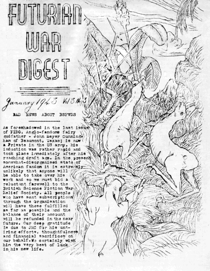 "If anything, the stf situation in Australia is worse than in England. We haven't had a regular (full-size) fanmag this year. S.F.F. Reporter appeared every Tuesday (yes, actually and literally a regular weekly fanmag) for a while, then folded up. Futurian Observer still appears now and then. Futurian Spotlight has just had its second issue. None of these, except Observer, have been more than a single sheet. There are the reprint Astounding, Unknown and Science Fiction, of course but a surprising number of them fail to appear out here. We have had all the Tales of Wonder, but there will be no more of those now.Graham is willing to trade the booklets he mentions for many recent issues of the British reprints. ALLSORTSOFODDMENTS Subscriptions expiring with this issue are those of F. A. Arnold, D. J. Doughty, J. W. Banks, and D.W. Gardiner... latter gentleman has now been called-up; present whereabouts unknown, the usual best wishes to him in his new circumstances...this will affect "Fidographs" we are afraid. Incidentally the picture and introduction of Roland Forster have been crowded out of this issue. Sorry....sundry moves -- Johnny Burke now near Nuneaton, Wally Gillings up at Catterick, Syd Bounds in Cornwall, Sid Birchby in the wilds near Sheffield, Bob Chittock has gone overseas, Bob Edwards has a new address - 34 Charlton Road, Brentry, Westbury, Bristol. Airgraph dept - Harold Gottliffe is now a Staff Sergeant and still at No 57 General Hospital. M.E.F; Bill Shelton is with No 118 M.U. RAF MEF wishes to convey belated but no less sincere good wishes to Mr and Mrs Harry Turner, and thanks BSF War Relief Society for sundry prozines which "had a big circulation in this particular strip of aridity"....re the Bibliography mentioned in the BFS Bulletin going out with this Fido to BFS members, please note that only lists of titles and authors are requested at this stage - further details will be requested later... Incidentally the Searles-Unger bibliography now being issued with Fantasy Fiction Field, two pages at a time, has now reached page 12, including two pages of introduction and a 2 page article dealing with the complete works of A. Merritt. The eight pages devoted to listing books takes us up to "Bu".. which means that it will be a goodly while till the job is completed - quite apart from the addenda and errata which we understand are rolling in. This effort includes all fantasy in book form published anywhere...have you noticed the two shilling edition of Dunne's "Experiment With Tine" now on all the book stalls? Published by Faber & Faber ...we recently noticed another new stf work of sorts in "The Prowlers of .the Deep" by Franklyn Kelsey, p. Harrap 8/- , and being a war story with a submarine powered by atomic engines, plus robo-soldiers and other interesting phenomena for twelve year olds...and before close, the very best wishes for the New Year and may 1943 be a happier year for us all. And thanks to all the kind people who sent me cards.