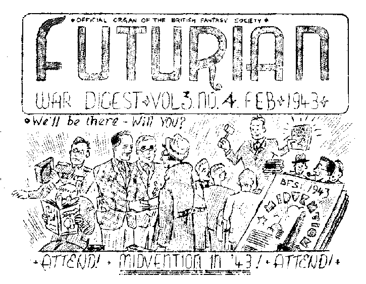 in the RAF. He says LOSS OF TRIPOLI but it should be spelt Triple-E ! Of all the American fans, the one least expected to be disturbed by current events was E. Everett Evans. EEE has spent ten years in the US navy, part of it during the last war, and is nearing the age of 50. But the perversity of fate has shown its usual hand, and amidst volleys of hush-hush EEE has temporarily withdrawn from fandom. Nor can he be communicated with whilst this enforced absence continues, which is likely to be for a year or more. During the brief while he has been active "Ol' Man Evans" has certainly made things hum, and it is sad indeed that the sorely stricken National Fantasy Fan Federation is now minus its President. MORE HERE AND THERE just received, first letter from John M. Cunningham since his induction into the US army. Present address is Pte. 616th T.S.S., Flight 67, A.A.F.T.T.C., S.T.C. No 5, Kearns, Utah, USA Bks 2125. More US call-ups are Norman Wilmorth and Charles Hidley, the "staff" of Fantasy Fiction Field. Deferred are Morrie Dollens of Minneapolis, Walt Liebscher of Chicago and John B. Michel (Hugh Raymond) of New York. Our own Ted Carnell is just recovering from a bout of tonsillitis and looking forward to a sick-leave resultant thereto. Art Williams (11 Kenbury St, Camberwell, SE5) wants particularly Astoundings for April 36 & 37, 39 Sep, Nov Dec; 40 Aug to Dec; 41 all but March, May (US only). Edwin Macdonald recently registered for the RAF - shape of things to come? Recent visitor to London was Sid Beach of Aberystwyth, who managed to say hello to RGMedhurst and Art Williams. Incidentally, the second issue of LENS the fanzine put out by Beach and RJSilburn, should be out in the near future. Anyone interested in a Bibliophiles Section of the British Fantasy Society, to circulate a chain-letter anent books, books and more books? BIRTH OF A SON "On Tuesday Feb. 9th Alys Rita had a son weighting seven and a half pounds, and with a taste for the mysterious ... at the moment John Parkhill Rathbone is a weird-looking thing, being only two and a half days old - like a future man, with a colossal head compared with his body, but when he obtains his University degree in about two weeks, he may look more normal. Meanwhile he will be cutting his teeth on "Principia Mathematica" and Hegel's "Principles of Logic" with a little Euclid on the side." This was the first bulletin anent our new superman received from its proud progenitor James Parkhill Rathbone to whom and Alys our heartiest congratulations go. Am I the Godfather, James? "FUTURIAN LAW" From Chief Futurian Attorney Vol Molesworth of the Futurian Society of Sydney; "I am preparing a standard Futurian Law text-book. To do this I need a copy of the rules and constitution of every fan club in the world, past and present. It is a big long task, but I intend to tackle it, for if all fan clubs adopted a standardised law it would make Futurian intercourse easier. Briefly, I want a complete set of data on a Society - copy of its policy, constitution and rules in toto, full list of decisions and precedents that are within the scope of the word "jurisdiction". When I get this from all fan-clubs, and after comparison, sift out the common parts, I intend to roneo it off, bind it, and send a copy to each fan club." |