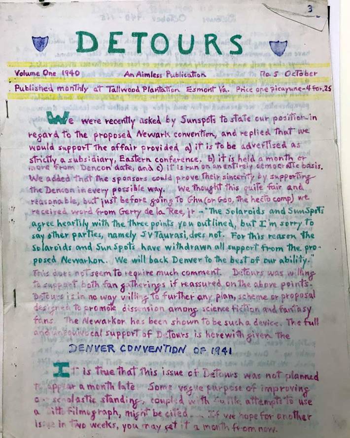 Below is the first ever appearance of the word 'fanzine' *anywhere*. It was coined by Louis Russell Chauvenet in his DETOURS #5 (October 1940) and gradually replaced the earlier 'fanmag'.