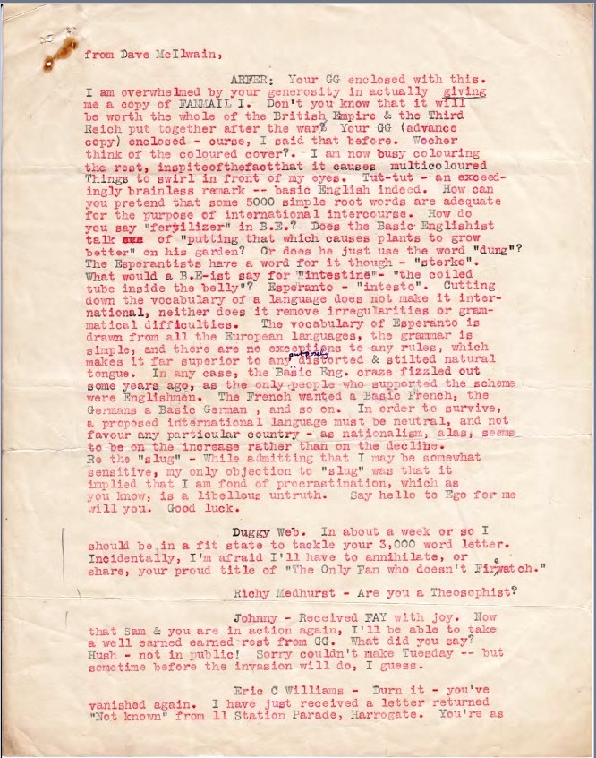 PPU = Peace Pledge Union HOW THE CHAIN WOULD HAVE WORKED (PROBABLY) According to its entry in the British Fanzine Bibliography, FAN-MAIL was produced in an edition of five copies. So a top copy plus four carbon copies, about the maximum you could produce at one time if you wanted the bottom copy to be readable. You would have had to have struck your typewriter keys pretty hard, indentation evidence of which should be clear on the originals of the above scans. When adding his contribution to the bundle he'd been sent and mailing it on to the next person on the chain, each individual would also mail his carbon copies to Clarke. You'll have noticed that the mailing card at the top of this page is labelled 'Copy 1'. It has five names on it, plus Clarke's. Since up to twenty-five people were on this chain we can infer there were eventually five copies going around, each copy-group containing no more than five people, plus Clarke, and each copy always ending up back with him. We can also infer that each copy went out with a different scribbled page of comments by Clarke attached - no carbon copies for him! This was FAN-MAIL #3. When sending out copies of a new issue, each would have included carbons of letters from the previous issue except obviously for those from the people in that particular copy group. What this meant is that as well as responding to letters from those in your copy group for this issue, you would also be commenting on letters on the previous issue from those in the other copy groups. This also meant that even leaving aside Clarke's scribbled page, no two copies of a given issue were ever the same anyway, though the juggling of top copies and carbons would've resulted in everyone eventually getting to see the same letters. Mostly. Whether who ended up in which particular copy group was random or not is obviously unknown - though I will note that most of those in this particular group are Liverpudlians. However, based on this complaint from John F. Burke those copy groups had become more rigid than originally intended: