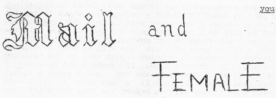 ==At least, that is what I think the word is. I never was much good at deciphering proscriptions== I would try your patience with a very odd question or two. ==You go fool around with your own patience. they need you more than I do== A) If Femizine married Space Diversions, would the result be something infantile, like the Vargo Statten Mag? ==As long as it wasn't a BEM I don't think I would mind== B) Would not a World Programme of Eugenics, if applied, be wonderfully successful in also breeding out things like the Fan, the Editor, and the Author of science fiction, in that order ? ==This sort of thing puts me in mind of Scarlet O'Hara saying to Ashley "How can you stand there when it is us who are being weeded out". My mother and father might have more to say on the subject== C) Does Femizine agree with the sweeping generalised conclusion arrived at by Dr. Swinebaum in his 'Monograph on Sex Perversion among Tadpoles', with brief notes on instances of passion among Immature Salamanders"? =No, we don't. His conclusions were not sweeping enough. The gutter was too far away== D)Has Femizine ever heard of Dr.Swinebaum, and is the periodical aware that he's pigeontoed and for this as well as other reasons he has to be faithful to his wife, a not very prepossessing creature? ==I believe the good Dr. was once at school with a man called Kinsey but he couldn't stay the pace. He was too backward in Biology.== E) Would Femizine care to be associated with advertising detergents, which I have been given to understand by a Mancunian authority is a most profitable side-line? ==No advertising== F) Would Femizine care to print this admittedly not very poetic or in any way meritorious bit of verse?