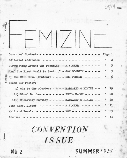 I've seen worse artwork. I expect you've seen better letters, too, =Depends on what you look for in a letter. I see you are playing no favourites, Paul. Scared of us wimmen?== Stuart Mackenzie: Since all three of you are widely separated geographically, and I am not at all sure as to how telepathic you can get, even when running a highly special thing like a femmezine, I am writing to all three of you. This, I might point out, is quite a thing, involving as it does not only one stamp but three ....... such generosity from an Aberdonian like myself should shatter you. ==I'm the original Triplex. You want to meet my sisters?== I am delighted that you are at last in production. I would not dare to disagree with the contention that it is high time the femmefen had their "Woman's Own" now we can get a concentrated feminine viewpoint, all neatly wrapped up in 30 pages of purely feminine effort. Or at any rate feminine effort. Much better than the dribs and drabs (nothing personal meant) that are all we have had in the past. The front cover -- hmmm. Who was the model? Will she be at the Con? Nuisance about my wife wanting to go too... The size also is appealing (of the tine that is) I have always liked my women to be a little smaller than I, and so I think do most men. In company with most other faneds I go quarto - therefore it is entirely fitting that Femizine be smaller. ==Which could be one of the reasons for the fact that FEZ is now quarto!== Hey, what's this? "Unite the minorities to get a better hearing in the fan world'. Huh? You'd better all join the Vargo Statten Fan Club! Believe me - and I KNOW - the feminine element in this part of the world, at any rate,(and indeed at all costs) gets a better hearing than the male. We HAVE to listen: THEY just ignore our 'idle chatter'. Come to the Globe when Constance (my ever-loving), Dorothy, Iris, both Pams, Daphne, Joy, Cathie, Hetta, Margaret and the others are having a quiet chat. We men are outvoiced two to one: that is to say, there are only two of us to one of them - we haven't a hope in Hell of being heard. ==I hope the ladies you mention get around to subscribing. Then you had better stay out of the place for a while. You are safe at the moment though !!!= Femizine One certainly is an eye-opener. This Carr dame I must meet: ==Next year buster. Get in line.= she certainly lets the old libido go. So do the others, from what I see...look at these revelations and implications of feminine lust. Pages 3&4 What didn't you dare print that made up the rest of the Diary for that week? Page 8, Illo and text both... Page 15, the verse thereupon is one which I personally wouldn't dare print in ST, in case the women readers were offended: then you people go and do it. Much the same applies to the obviously Varleian quotes on these pages