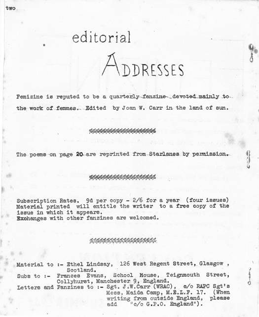 ==I take it they were trying to pen you in== all to no avail, they were easily repulsed. The defence was led, so I am told, by a small-sized whirling dervish with a short haircut and horn- rimmed spectacles. ==How repulsive== He was abetted, so police records say, by a kilt-wearing, Gaelic-gibbering female swinging a bottle of gin in one hand and some pornographic literature (Femizine) in the other. Take my advice - have nought to do with that rogue Sanderson. He has been having a helluva time with Frances and Ethel. On Sunday night there was a party in the Liverpool Group's room and, well I blush to remember it. ==I heard you couldn't remember it== Sandy seemed to be letting his passions loose on all and sundry. Ripping the clothes off Ethel, Pat, and Ina he then turned his attention to the rest of the room and had completely stripped Terry Jeeves, Norman Shorrock and had Frank Milnes half stripped before he realised the subtle differences. Oh, he was bad, let there be no mistake about it. I don't know what you have been feeding him on over there but he came home definitely on the look out for seductable material. Chain him up when he gets back. They say that starving is a good remedy for his complaint. ==You feeling hungry yet Brian? This boy sure has a terrific imagination, I hope. No wonder Stu said "obviously Varleian quotes".== At this point in my letter I should have commented on FEMIZINE but unfortunately I don't possess a copy. I had a copy pressed onto me at the Con early on Saturday morning. For safety I put it under a pile of Combozines, all the same, when I came to look for it, the thing had vanished. ==The main reason for the inclusion of this letter is simply so that I can say - were they as popular as all that?== ==And then there is the other side. For example.= Ethel Lindsay I'll let Sandy tell you all about the Con, but don't believe a word of what he says about me. ==Like I said, I just don't know who to believe== That is only so you won't believe me if I start to tell you about his ongoings. ==Have we a translator in the house?== Come to think of it, don't believe anything Frances tells you either. The pair of them are desperate characters and I had a high old time looking after them I can tell you. ==I thought Sandy was looking after you, or was that Brian Varley?== It (the Con) was wonderful, riotous, crazy, full of laughs and with never a minute to catch your breath. =Whisky or gin flavoured? Lady, were you gone!!== There was only one thing wrong as far as I was concerned, and I demand Justice. Listen while I pour my tale of woe in your ear. No one can call the Scots mean any more. I have left a trail of belongings from Glasgow to Manchester and back. First of all on my journey down I lost a ring. Took it off to wash my