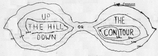 at one time I was hotly defending Terry with the words "But Terry's a gentleman at heart". In a somewhat mournful voice Terry muttered that it was only "because I can't get any morals", which is double punning with a vengeance. INA: The afternoon session began with a seemingly serious talk on the Atom by Frank Simpson, a research chemist. This talk was much enlivened by little notes being passed around. One, a remark about a diagram thus ⌒ ⌒ on the blackboard Frank was using, read: "Is that a drawing of Sandy's camel, or a plane view of Marilyn Monroe?" Next on the stage was Alistair Paterson who wanted to know what sort of covers we wanted on our mags. This was a clever device, because obviously fen opinions would differ so widely as to make it farcical. Jim Rattigan and Terry Jeeves assisted by sketching for him on the blackboard.