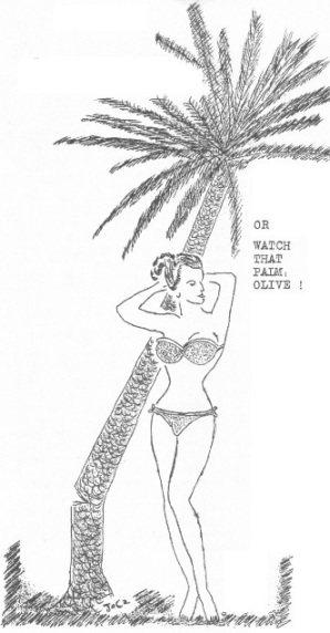 TED CARNELL: 17 Burwash Road, Plumstead, London SE18, England. I particularly enjoyed the Con reports – it would appear from this (the fourth I have read), that I must have attended a Con at the Deansgate Hotel next door to the Grosvenor about the same time! (Only a Mancunian will appreciate that one.) Especially I want to tell about next year's Con which is being planned as the Convention to End All Conventions. After this nobody will dare run a Con... It is being planned along the lines of a French brothel. ((You mean it will be an enlarged version of THAT party?)) We are taking over an entire hotel with exactly half the number of bedrooms required, thus everyone doubles up. No husbands allowed with wives and vice versa ((and I doubt if you could get any versa vice any other way)); no two fellows allowed to sleep in the same room, ditto women. There will be three sleeping periods per day allocated to everyone throughout the three 24-hour sessions, which will be held at Easter not Whitsun, thus getting in an extra day and night of debauchery. Only people without morals at all or the most broadest of broads should even contemplate going. ((But won't Brian be lonely?)) Me? I don't expect for one minute that my wife will let me go, so I'll see you at the one in 1956 wherever that will be held… ((I wonder what film they'll show??)) ((PS. He's only joking – I hope!)) BOB TUCKER: Box 702, Bloomington, Illinois, USA. Many many thanks for the copy of Femizine, issue two. I enjoyed it very much… especially the convention article… and will have to accept Eva Firestone's hint. She wrote me not long ago reminding me that she would accept subscriptions for the magazine. I didn't know what she was talking about at the time, for the zine had not then arrived, but I know now! I don't believe I received a copy of the first issue. Do you have a spare one you might send me? Eva can deduct the cost from my subscription money. ((Isn't it just too too sordid to talk about cold cash? But then why should I end up in the red if it can be avoided? The first issue was for free, Bob. You should have gotten one. I haven't got any left here, but Frances will send one 'badin' - if she has any! How's that for international writing? English, American and Arabic. Clever)) I've read several Supermancon stories ((You mean articles hmm? – or do you?)) in several fanzines now and I'm puzzled by one aspect that is either prominently mentioned, or prominently omitted. The business of the necking parties on the beds in