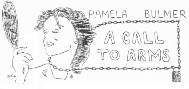 vainly to learn the secret of that effortless quote, the scintillating wit, the graceful charm and understanding. But they are spellbound; they are too busy hanging on our every word like the 'o's in a badly cut stencil. We will stop at nothing. We must stand together. Have no pity, women of famdom. You must be ruthless and our menfolk must henceforth look to their laurels. It is time a woman wore the beanie in fan households. We will fight for our rights! We demand the right to be recognised as the brilliant species we are; the right to be admired, not just for our beauty – though we must never allow that to be forgotten – but for our intelligence, our wit, our unfailing patience and ungrudging silent aid. We must claim our rightful place at the core of fandom. Now we cry out against their unjustness, we will fight to the bitter end. Break down the doors of their dens, snatch the duplicators, seize the ink, the stencils and all the paraphernalia of fanac that we have guarded so faithfully and so thanklessly. We will chain ourselves to the lamp-posts outside the Globe and every fannish club or meeting place and we will not go until we are acclaimed with due respect. We will go on hunger strike, and if any of us die in such a brave cause our deaths will lie like an inky black smudge on every fanzine and, on a sudden, there will no longer be witty quotes alive on the bacover. Nirvana will publish a black border edition. No more will we stand like guardian angels ready with the life-giving tea or bheer, at their beck and call like slaves to do the bidding of serious and constructive Dan Dares seeking the enchantment of Trufandom. There will be no lack of volunteers to be the first martyr crushed beneath the wheels of the bearded motor-bike and the stain of her militant blood will turn in the wheels of the rider's mind so that the pages of Authentic are stained for ever and the beard is clogged into a mere shadow of its once beauteous self. She will go down into history as the first martyr of famdom and we shall see that her sacrifice is not in vain. To arms you shackled slaves of marriage! You who economise with the housekeeping, going short yourselves, nay all but starving so that they might buy their duplicators, their ink and paper, their stencils and their infamous magazines. An end to all this. United we are strong. Let them brew the tea whilst we besmear ourselves with ink and swearwords, producing the gems of wisdom for which we are justly famed. Women for fams! Fams for women! Women of fandom – the path is plain before you. The fen circle aimlessly and do nothing but yak. Let us take over fandom and show them how to do something and still yak. Famdom expects this day that every fam will do her duty.