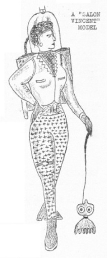 The Daily Satellite (8th October 2054) Good news for Spacewomen! This season's Paris dress shows bring us the glad tidings that those clumsy, bulky spacesuits you have all been wearing for the past thirty years are now definitely OUT, but definitely! No longer need you hide those feminine charms while away from Earth – dainty spacewear made possible by painstaking research in the great dress houses of Paris is now YOURS. The helmets in these new suits are of the finest transparent plastic deliciously shaded in a range of pastel colours to enhance the dullest of complexions, while the six inch headroom gives scope for quite a variety of hats inside. The new materials make the shaping of the suit itself much more flexible, so that they can be made in the latest fashions and to fit any figure, as the following details of those I saw yesterday will show. The hip drape. This up-to-the-minute feature is cunningly cut with fullness on one side to conceal your oxygen cylinder. The breathing tube from this is more efficient than its ungainly predecessor, enabling it to be very