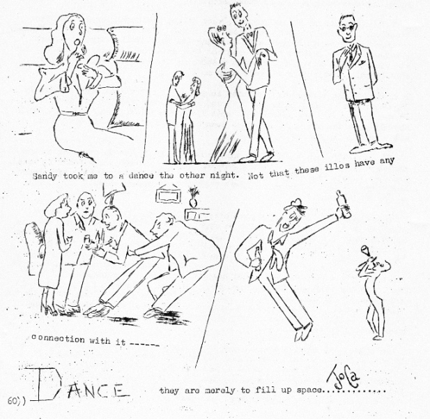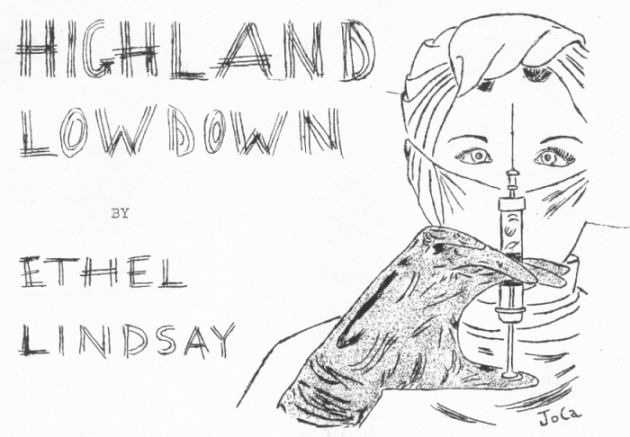 JOAN – HER BIT: Due to the present state of affairs out here, I'm starting this one week after mailing the last issue. ('This' being a mixture of the fanzine review column and the letter column cemented with editorial thoughts.) The idea is to cut the stencils as the material comes in, and then duplicate the pages week by week as the opportunity presents itself. Consequently I have no idea what will be in this column or what it will look like when finished. You'll just have to take....