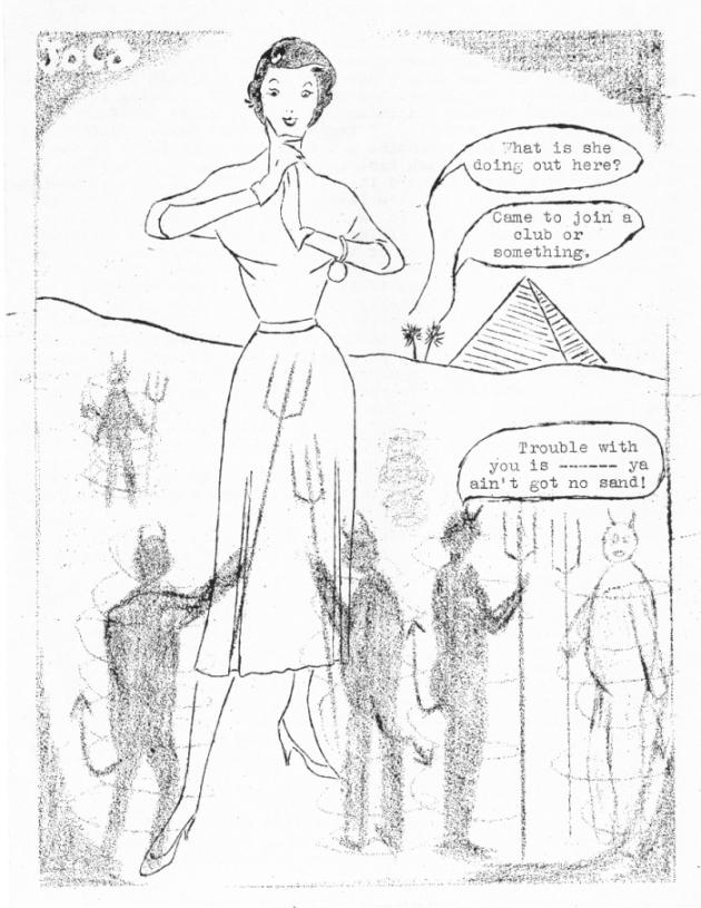 The cartoon on the opposite page would appear to have been very timely since it assuaged the wrath of the Lord High Muck-a-muck Chief Devil himself. Yes, I have just been visited by Khamsin (whirlwind to you) and, instead of bringing the office I am in down around my ears, he simply bowed slightly towards me and then rushed past the office and through the other ranks' tent lines. Now, all is well with the whirled once more – or at least I think it is, but I can't be certain because most of it is about two miles away by now. The things these winds pick up! Ugh, nasty, put it down. You never know where it's bin.
