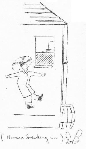 "I've locked myself out without any change for my bus fare and I can't get back in," I announced. Norman said ooooerrr and he was very sorry and what was I going to do now? Before I realised what I was saying I'd said you'll have to break in for me and had ushered him round the back. At this point I spied one of my neighbours and thought better of allowing Norman to climb over our fresh broken white paint. I said I'd manage. By this time my mental television set had caught up with me and I had a gorgeous picture of Norman breaking in to my own home for me and gallantly letting me in. (For appreciation of entertainment value of mental images – apply Walt Willis.) For some peculiar reason this mental picture stayed with me nearly all afternoon and Norman at least must have wondered why I spluttered into hysterics every so often whilst trying desperately to carry on a conversation