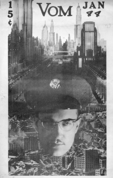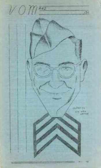 Ackerman has sent out several copies of the Fort MacArthur Reception Center ALERT's first annish. The camp paper, twice its usual size, devotes three pages to reprints of headlines and cartoons from previous issues. Of interest to fans are Cpl. Ack-Ack's ”Barrack Bunk" column, also much larger than usual, in which he reprints some of the year's "best" puns; and the feature story about the growth of the ALERT which devotes a paragraph to Ackie's work on the sheet and how he became associate editor.... Another Ackerman reprint from 'The Alert', this time from the 4 Feb 44 issue, appeared in FFF #161-162. Purporting to be a letter from the future, it described how important war bonds had been. The cover of VOM #29 was a rare instance of Ackerman featuring himself in uniform in his fanzine, though he later used a cartoon of himself ("stencilled by Wild Willie WATSON") as the back cover of #42: