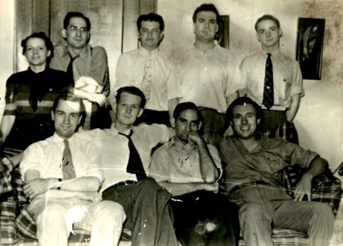 "But the pay-off came when a [West] Coast fan and his Lady friend walked in dressed in clothes of the future." Why relegate me to the category of "lady friend"? Why emphasize the feminine? Why not say "Two West Coasters came dressed in clothes of the future"? I may be a friend of another Pacificoaster but I was at the Convention as a fan. Quite right, too. While there were women who attended cons and other fannish events purely to accompany their husbands or boy friends, most of the women in LASFS had joined as fans in their own right. That some later married male fans did not change this. Here's a group photo taken at the convention:
