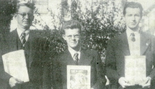 To begin with, I was born. Why is something I occasionally wonder about. At any rate, since the autumn equinox of 1923, I have been here on this (screwball) planet. Most of my life has been spent in Hawaii, the majority of the remainder in the state of California. (My parents never worked for advertising agencies, and I do hanker to see how the other half of this country looks.) My interest in stf dates back to the Blue Books in which was 'When Worlds Collide'. Someone carelessly left them lying around the house. The next year found me in California, but some time ensued before I discovered the stf pulps. I managed to keep abreast of things stfic for a year or two, but when I swam back to Hawaii in 1935 the financial difficulties peculiar to one's youth set in again (I had been subsidised previously by a tolerant if baffled grandmother) and my interest perforce waned. Three years later those obstacles had been surmounted, and I began collecting stf on the largest scale the local newstand world permit. I rediscovered 'Astounding' in time to send a frantic letter to Campbell, and thereby fill out my file of 'Grey Lensman', but the local newstand would not (or could not) get ASF regularly, so I had to suffer until I went to Honolulu during the summer of 1940. Then Honolulu suffered. Spring of 1941 saw me return to the island Eden that was my home, and lose contact. The summer of 1942 found me on the mainland for the duration, and I made my first contact with fandom: Anthony Boucher, who introduced me to the GGFS [Golden Gate Fantasy Society], organised (sic) fandom, fmz, stfventions and other things without which my life now would not be worth living. Eventually, like all true fans, I moved to Los Angeles and was subjected to regular and heavy doses of bacillus fmzii. I recognised the symptoms early, and thought it might be possible to gain the glory of fan publishing with but a fraction of the expense and toll. The dread day was forestalled temporarily by collaboration with Mel Brown on the first FAN SLANTSs. Now, however, I bow before the will of the gods, and hasten to take up the typewriter and stylus. Something - at this time I know not what - will be slipped into an envelope, and mailed to you. It is my desire that it meet with your approval. If not the postman and I are prepared to fend off your brickbats. At least, I hope the postman is. - ECCENTRICS ORBIT (June 1944, ed. Fern) T. Bruce Yerke (1946): C. J. Fern Jr., known to his intimates as Mike, and also renowned as "The Little Man with the Big Briefcase," made his first appearance among Los Angeles fan circles just over four years ago, coming down to the LASFS following an attendance of the first STAPLECON in San Francisco. [Since that STAPLECON was held on 16 May 1943, just under three years is closer to the mark - Rob] After one year of active participation on the local merry-go-round, Mike decided that the Pentagon Building in Washington D.C. would be a nice quiet place to spend a vacation. Accordingly, he left for the Capitol, where he monitored enemy broadcasts for the FBI. Fern, a small, heavy-bottom fellow, scarcely five feet tall hails from Hawaii [he was there when the Japanese attacked Pearl Harbor - Rob], where his father manages radio station KTOH not to mention having a finger in other island enterprises. While in his native habitat C. J. was a sort of newspaper man. He served, during his first stay in Los Angeles, as an efficiency expert in a furniture factory, conveniently owned by an uncle. In addition to this he has been active in the LASFS, usually performing tasks no one else would consider, such as dummying, stencilling, contacting publishers and authors, writing official correspondence, emptying waste-paper baskets, delivering messages, passing on hot tips, reading our scientifiction mags for us, and scurrying about on strange missions of his own. The initial appearance of this small, highly active organism (believed by many to be powered by a diluted solution of adrenalin, pumped by a Wright-Cyclone turbine generator) was at the first open house of the LASFS, where at he came by invitation of Ackerman. Fern does not live for stf alone. For some time the LASFS was littered with great yellow sheets of mimeographed matter being Fern's "Shortwave Information," a magazine for radio hams. Aside from a very comprehensive knowledge of radio, Fern and Mel Brown explored the intricate workings of Southern California's urban transportation system. Between them they discovered how to go from Pasadena to El Monte by way of Glendale, Van Nuys, Brentwood, and Watts. This is tantamount to a New Yorker going from Manhattan to the Bronx by the way of Williamsburg Bridge, the Brooklyn Speedway, Cross Island, Whitestone Bridge and Eastern Blvd., Grand Blvd., and 161st. When not locatable in town on a Sunday, it was a sure bet that these two were out on one of their utterly mad transportation adventures. As to the personal idiosyncracies of le Fern, a vast, new field of psychological research can be opened up. On one occasion, Fern was observed to sit down in mid-air while reading a copy of 'Astounding', and to retain this position to the end of the story. On another equally alarming occasion, Fern was atop a small stool, the better to reach his large and complicated radio set which formerly adorned the top of one of the bookcases of the LASFS. After making certain necessary adjustments, he took a glance at the 'Astounding' in his hand, and became so interested that he remained standing atop the stool for some twenty minutes until someone called attention to his dangerous position. Often while reading, Fern's glasses get in the way, and thus they spend a great part of the time in a doffed position high on his forehead. This same phenomenon occurs when Fern is stencilling. In fact, the only time that his glasses are not shifting from high to low is those occasions when Fern is walking, or in transit from place to place. Naturally