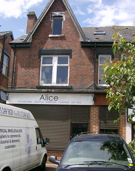 "9 Brunswick Terrace was demolished with many other properties when the present Merrion Centre was built. Brunswick Terrace still exists in part as a thoroughfare parallel with the rest of Rockafella's & Cinderella's Disco & Dance Halls. The clubroom was on the left-hand side approaching from Clay Pit Lane." 4. ROUNDHAY ROAD Bert Warnes again: "April 1938 - Sept 1939: We now come to the real hey-day of Leeds SFA, which was now comfortably ensconced at 312 Roundhay Road. The premises consisted of an attic flat over some shops, which we were delighted to obtain through the efforts of George Airey, who was able to again prevail upon his employers (the builders and estate agents I referred to earlier on). The flat was sited opposite the Clock Cinema and was undoubtedly the best venue we ever had. In fact it was to cosy and comfortable that George and his wife, when they married sometime later, occupied it as their home for some time to come.