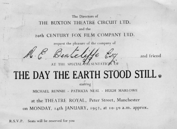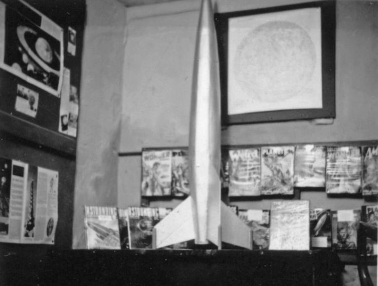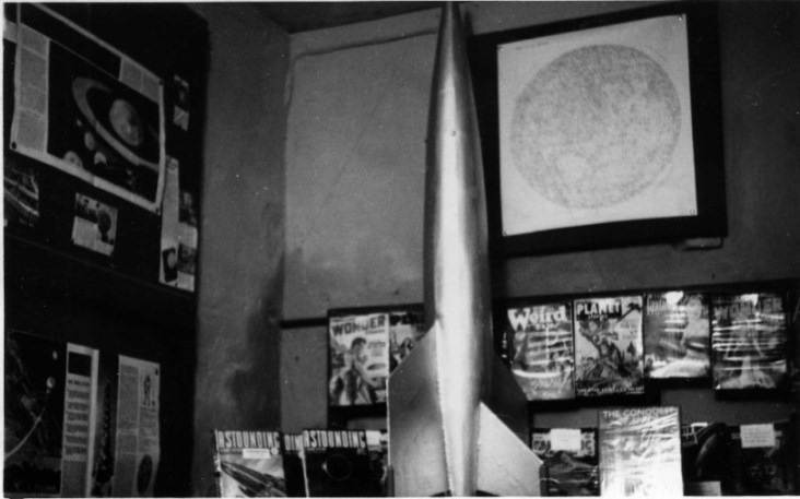 During this week [February 10th] the Gaumont were showing the then current The Day The Earth Stood Still. We arranged with the manager to display a number of Science Fiction books and covers in the Foyer, and in return we advertised the film at our premises. We had the walls of the Space Dive covered with S-F magazines, for which display we are indebted to various members who placed parts of their extensive collections at the Society's disposal. In all there must have been about one thousand magazines gracing the now clean, walls. In addition to this our Treasurer, Norman, constructed a model of a spaceship which stood 5' 4" in height, this, placed in a lunar setting contrived by another of our members looked extremely effective. Several other members volunteered to stand outside the Gaumont and hand out a leaflet explaining the Society's activities and