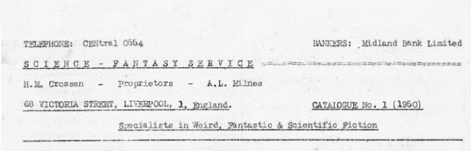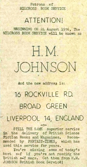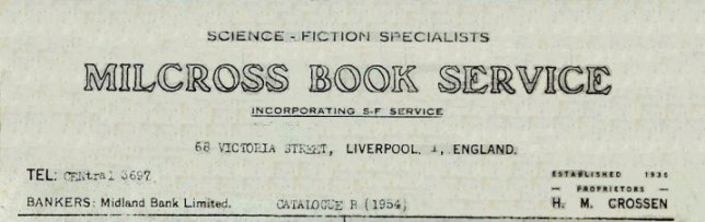 Just as he had with the pre-war Liverpool SFA, Johnson let the newly formed Liverpool SF Society (LaSFaS) hold it's early meetings in his shop. As member Tom Owens later recorded: On Monday the 12th November 1951, we, the Liverpool Science-Fiction Society held our first meeting at the rear of the Milcross Book Shop. At that time we were not grouped under any name, but were just a number of fans who had met as a result of a Post Card sent to, each of us by Jeff Espley, the founder of the Society. The final Milcross catalogue I have is dated 1954, by which point both the Brownlow Hill shop and Frank Milnes are gone (they were still there in 1953) and Johnson has returned to trading from 68 Victoria Street: