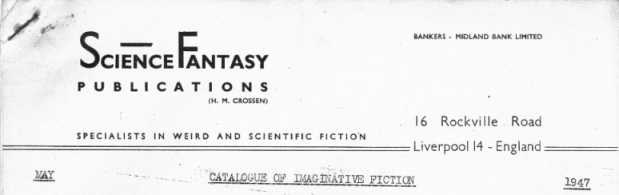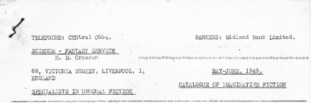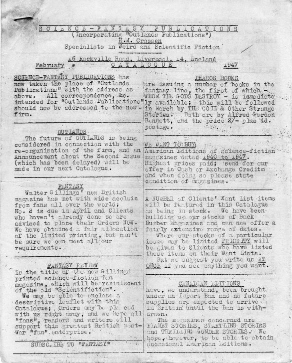 Founded by Les Johnson and Ted Carnell in 1937, the Science-Fiction Service was the first SF book-selling business in Britain, though the name they used for business purposes was that of Johnson's brother. Its pre-war existence is covered here. I've recently taken possession of a bunch of post-war catalogues, courtesy of Steve Holland. The earliest of these - front page below - is dated February 1947. It may in fact be the first post-war catalogue: ![]()