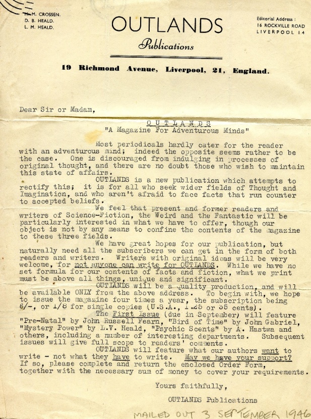 The crunch came when the main newsstand distributors returned the 'unsolds' to us. They were all still in the original wrappers, and it was obvious that they had never got outside their warehouse, much less than on to the railway bookstalls! It is all very well talking about "newsstand distribution", but try and get it... As pre-war, Johnson didn't use his own name on the business. Once again he used his wife's maiden name: Hilda Margaret Crossen. By May 1947 all mention of 'Outlands' has vanished from the now-printed header: