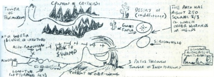 The Board. The general layout is as illustrated, with more detail than shown, many of the squares on the route are coloured and have numbers on them. Others have such cryptic words as 'Spirit' 'Oneshot’, ‘Falls into Torrent’ and ‘Lethargy’ written on them. These constitute hazards of one sort or another.