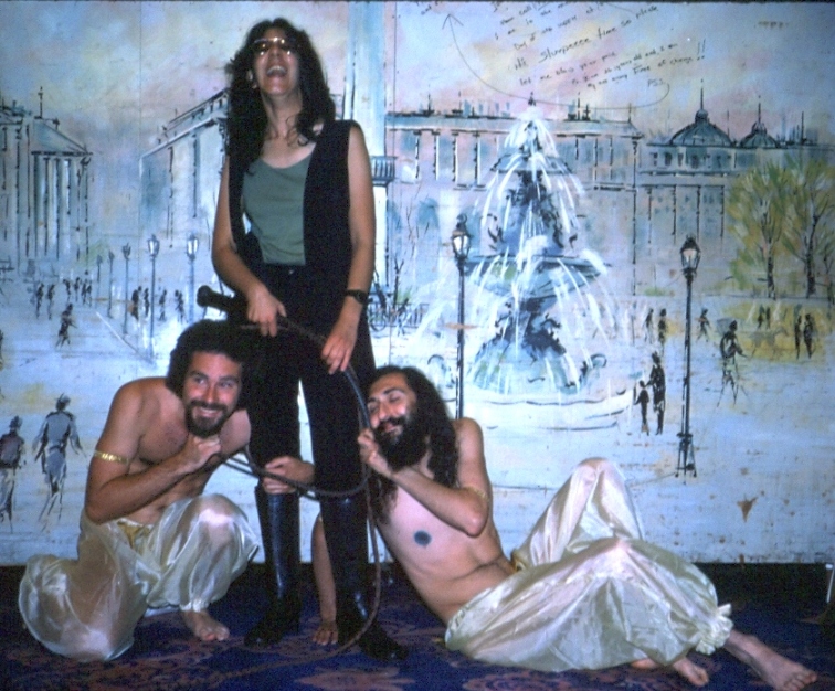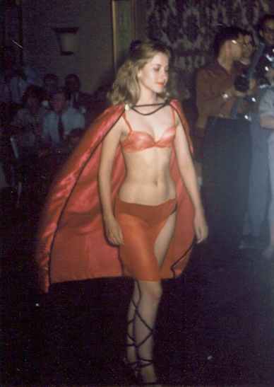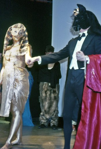 Finally this image, taken at the 1977 Worldcon Masquerade, depicts the 'Slave Boys of Gor' and was done with obvious political/satirical intent. Costuming critiquing particular works of SF was pretty new back then. However, the satiric intent may have been lost on several guys who sidled up to Avedon after the Masquerade, hinting at their interest in S&M. So it goes.