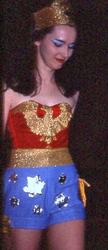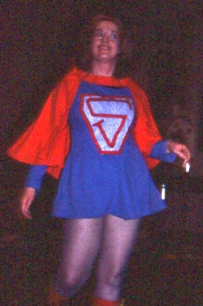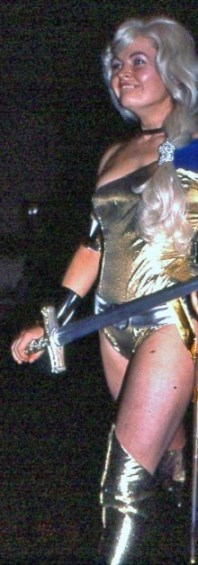 One development as cosplay progressed was the making of ever more accurate copies of the costumes worn by characters from TV and movies, or depicted in comic books. Fans of the original series of Star Trek had long managed to produce these, but then those uniforms were fairly simple and easy to copy. When it came to more involved costumes it took a while to get to the point where these were almost always accurate copies. Before this things could be a little more hit and miss, not least because while some took their costuming seriously it was still just a bit of fun for others. Take, for example, these worn for the fancy dress at the 1977 Eastercon - Beth Hallam as Supergirl, Jackie Wright(?) as Wonder Woman, and Helen McCarthy as Valkyrie (photos by Lars Olov-Strandberg):