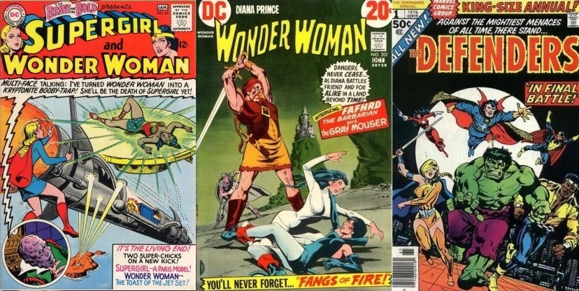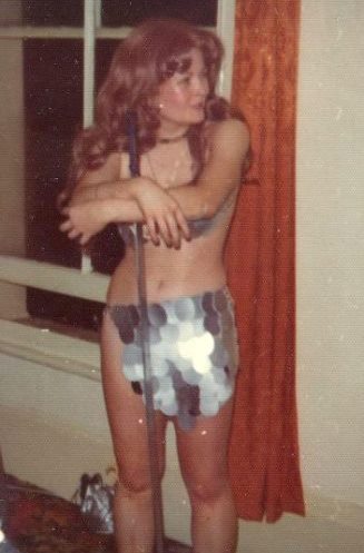 Oddly, Fritz Leiber's Fafhrd and Gray Mouser *did* actually meet one of these superheroes in the pages of a comic book, as witness the middle image in the triptych of covers above. This was during Wonder Woman's depowered 'Emma Peel' period and, surprisingly, the story was scripted by SF writer Samuel R. Delany. Helen McCarthy - a leading candidate for UK queen of cosplay during the mid 1970s - did not confine her costuming to conventions. Here she is at a party celebrating her birthday in 1976 cosplaying Red Sonja (photo from her collection):