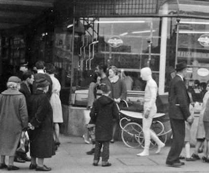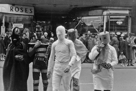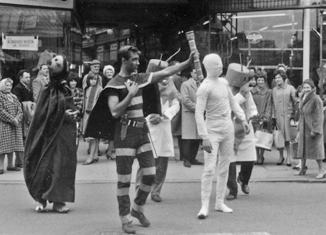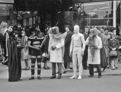 At the 1963 Eastercon - held that year in Peterborough - they decided to take the fancy dress out onto the streets to the evident bemusement of the locals. That's Charles Partington in the striped costume, others unknown. All photos are by Terry Jeeves: