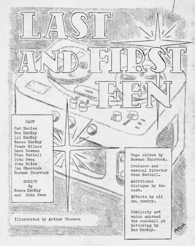 This was the Liverpool group's second 'tapera' and debuted at CYTRICON II, the 1956 Eastercon held that year at the George Hotel in Kettering. At the end of the tapera the cast and crew - all Liverpool group members - came on to the stage to take their bows: